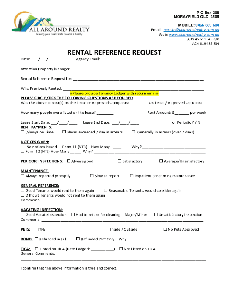 P O Box 308 MAYFIELD QLD 4506 MOBILE: 0466 683 684Email: narelle@allaroundrealty.com.au Web: www.allaroundrealty.com.au ABN 45 611 546 878 ACN 619 482 834RENTAL REFERENCE REQUEST Date:___/___/___Agency