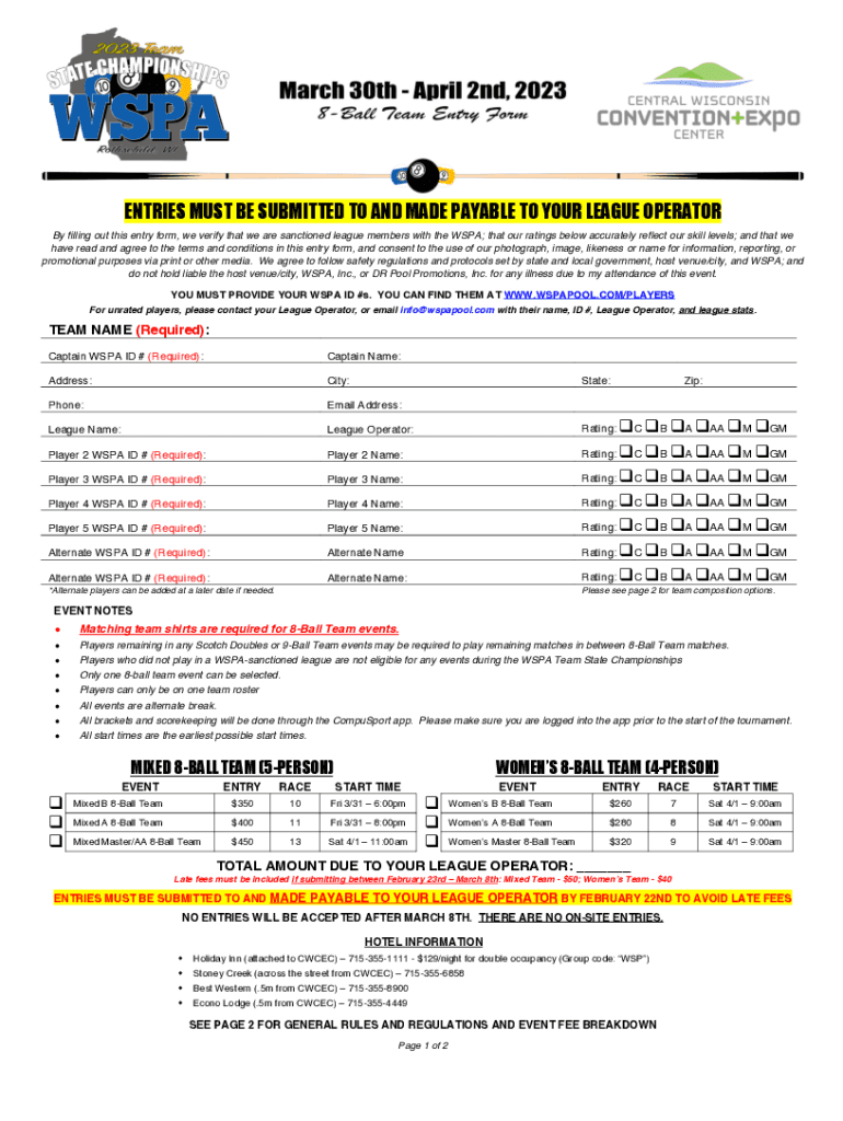 ENTRIES MUST BE SUBMITTED TO AND MADE PAYABLE TO YOUR LEAGUE OPERATOR By filling out this entry form, we verify that we are sanctioned league members with the SPA; that our ratings below accurately