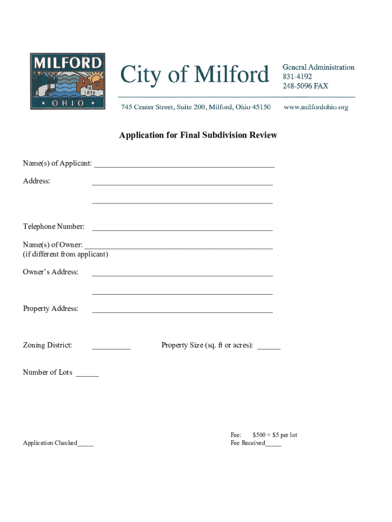 Application for Final Subdivision Review Name(s) of Applicant: ___ Address:___ ___Telephone Number: ___ Name(s) of Owner: ___ (if different from applicant) Owners Address:___ ___Property Address:___Zoning
