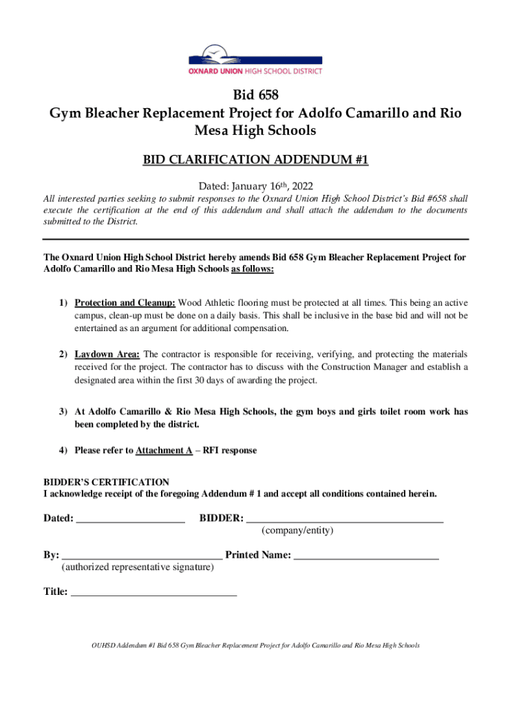 Bid 658 Gym Bleacher Replacement Project for Adolfo Camarillo and Rio Mesa High Schools BID CLARIFICATION ADDENDUM #1 Dated: January 16th, 2022 All interested parties seeking to submit responses to
