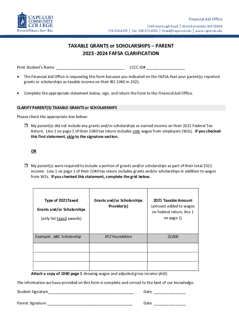 Financial Aid Office 2240 Iyannough Road West Barnstable, MA 02668 774.330.4393 Fax: 508.375.4026 finaid@capecod.edu www.capecod.eduTAXABLE GRANTS or SCHOLARSHIPS PARENT 2023 2024 FAFSA CLARIFICATION