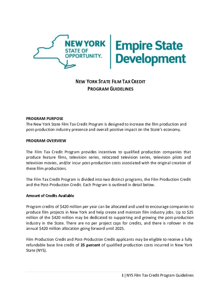 NEW YORK STATE FILM TAX CREDIT PROGRAM GUIDELINESPROGRAM PURPOSE The New York State Film Tax Credit Program is designed to increase the film production and postproduction industry presence and overall