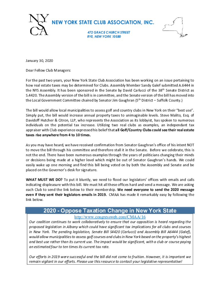 NEW YORK STATE CLUB ASSOCIATION, INC. 472 GRACE CHURCH STREET RYE, NEW YORK 10580January 30, 2020 Dear Fellow Club Managers: For the past two years, your New York State Club Association has been working