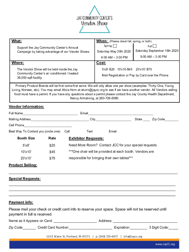 What:When:Support the Jay Community Centers Annual Campaign by taking advantage of our Vendor Shows(Please check fall, spring, or both)Spring Saturday, May 30th 2020 9:00 AM 3:00 Where:Fall Saturday,