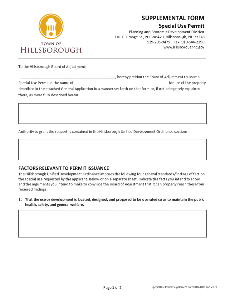 SUPPLEMENTAL FORMSpecial Use PermitPlanning and Economic Development Division 101 E. Orange St., PO Box 429, Hillsborough, NC 27278 9192969475 | Fax: 9196442390 www.hillsboroughnc.govTo the Hillsborough