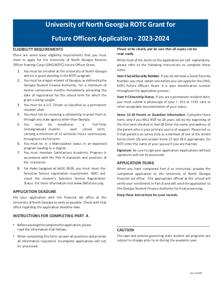 University of North Georgia ROTC Grant for Future Officers Application 20232024 ELIGIBILITY REQUIREMENTS There are seven basic eligibility requirements that you must meet to apply to the University