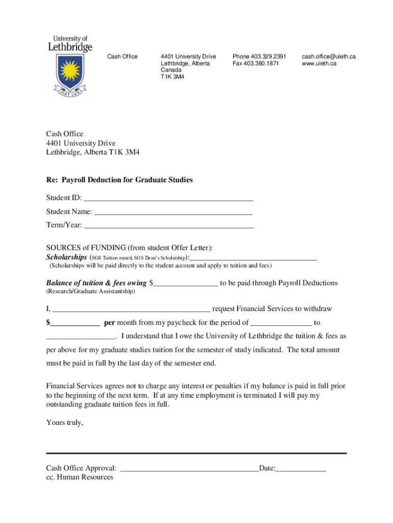 Cash Office4401 University Drive Lethbridge, Alberta Canada T1K 3M4Phone 403.329.2391 Fax 403.380.1871cash.office@uleth.ca www.uleth.caCash Office 4401 University Drive Lethbridge, Alberta T1K 3M4Re: