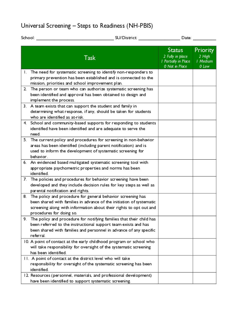 Universal Screening Steps to Readiness (PBIS) School: ___ SU/District: ___ Date: ___Task 1. The need for systematic screening to identify nonresponses to primary prevention has been established and
