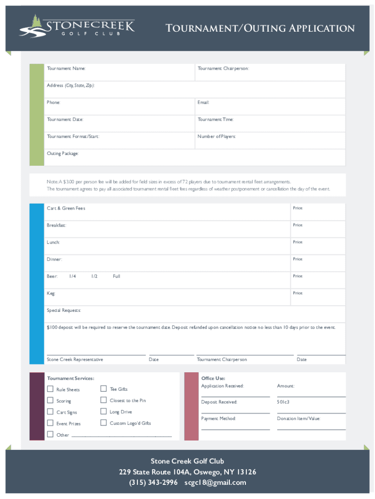 Tournament/Outing ApplicationTournament Name:Tournament Chairperson:Address (City, State, Zip): Phone:Email:Tournament Date:Tournament Time:Tournament Format/Start:Number of Players:Outing Package:Note: