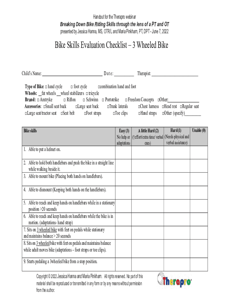 Handout for the Therapy webinar Breaking Down Bike Riding Skills through the lens of a PT and OT presented by Jessica Hanna, MS, OR/L and Maria Pink ham, PT, DPT June 7, 2022Bike Skills Evaluation