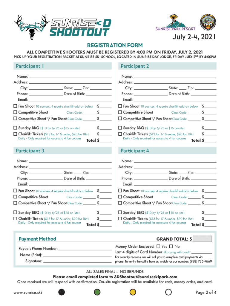 July 24, 2021ALL COMPETITIVE SHOOTERS MUST BE REGISTERED BY 4:00 PM ON FRIDAY, JULY 2, 2021PICK UP YOUR REGISTRATION PACKET AT SUNRISE SKI SCHOOL, LOCATED IN SUNRISE DAY LODGE, FRIDAY, JULY 2ND BY