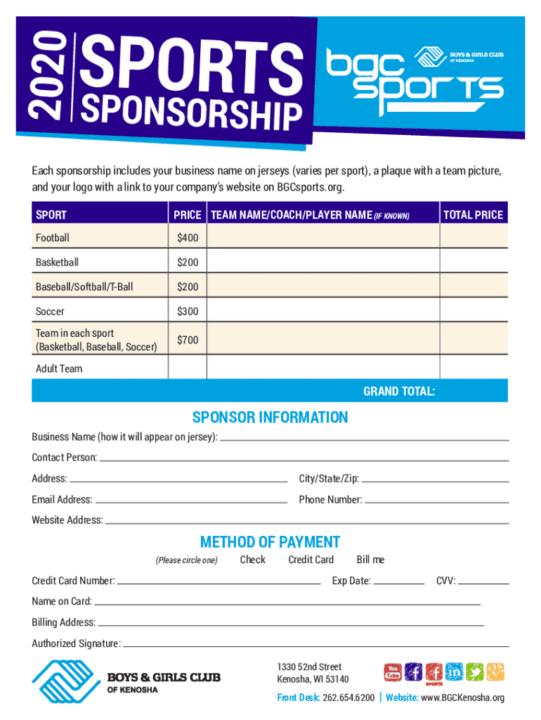 2020 Each sponsorship includes your business name on jerseys (varies per sport), a plaque with a team picture, and your logo with a link to your companies website on BGC sports.org. SPORTIVE TEAM