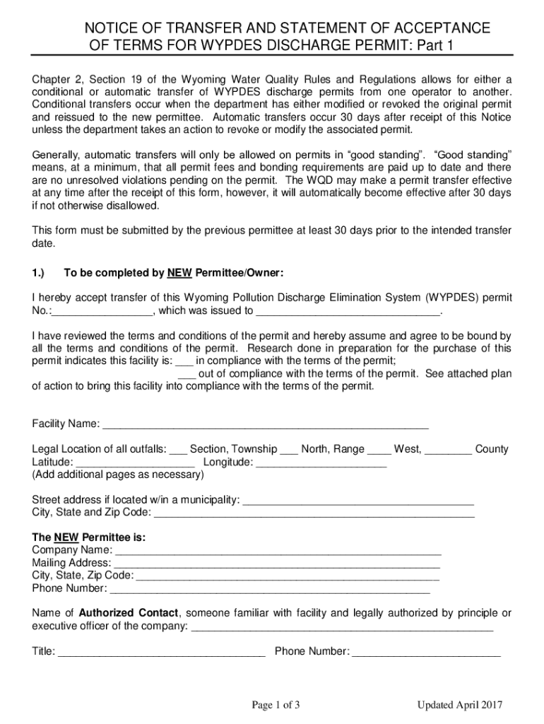 NOTICE OF TRANSFER AND STATEMENT OF ACCEPTANCE OF TERMS FOR TYPES DISCHARGE PERMIT: Part 1 Chapter 2, Section 19 of the Wyoming Water Quality Rules and Regulations allows for either a conditional