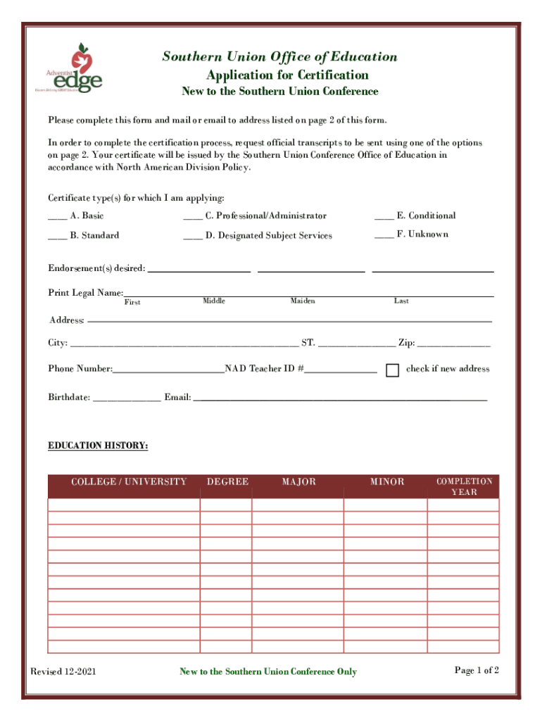 Southern Union Office of Education Application for Certification New to the Southern Union Conference Please complete this form and mail or email to address listed on page 2 of this form. In order