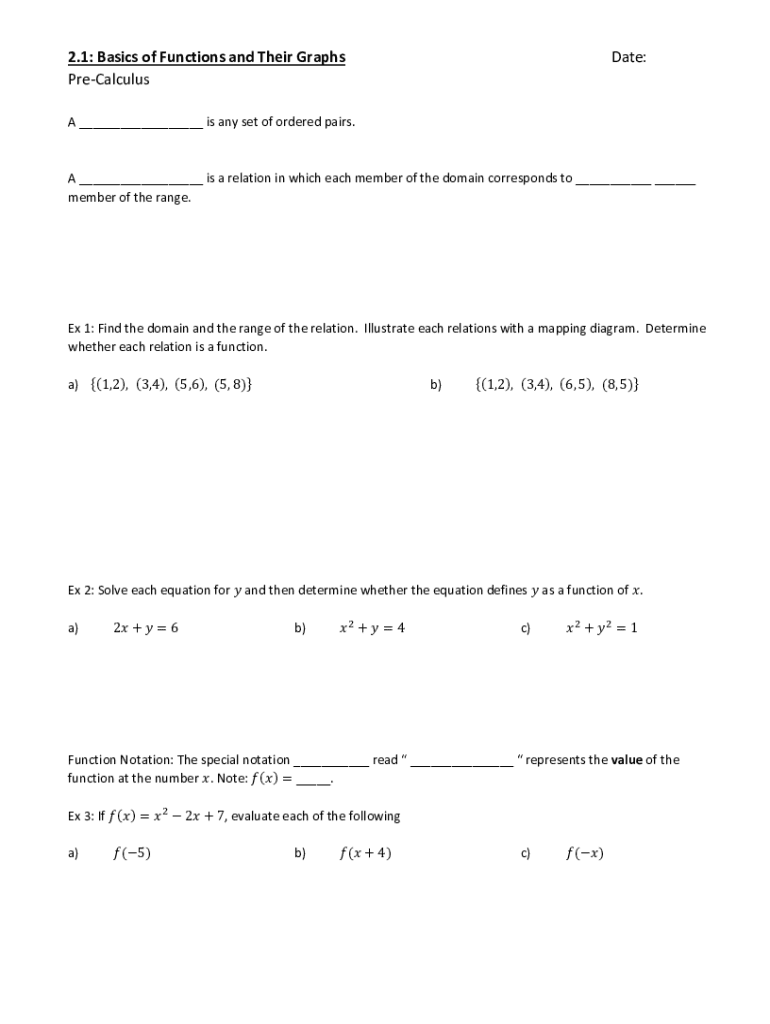 2.1: Basics of Functions and Their Graphs Precalculate:A ___ is any set of ordered pairs. A ___ is a relation in which each member of the domain corresponds to ___ ___ member of the range. Ex 1: Find