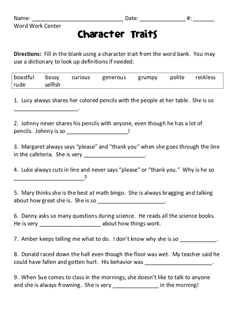 Get the free Word Work Center Character Traits Directions: Fill in the