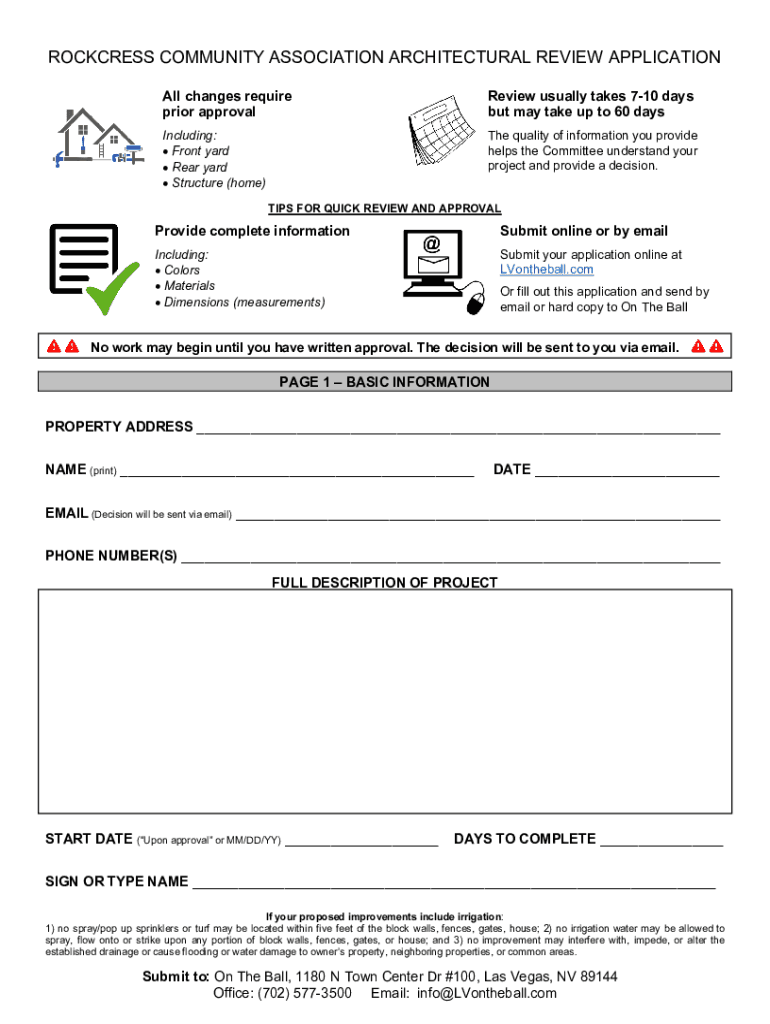 ROCKINESS COMMUNITY ASSOCIATION ARCHITECTURAL REVIEW APPLICATION All changes require prior approvalReview usually takes 710 days but may take up to 60 daysIncluding: Front yard Rear yard Structure