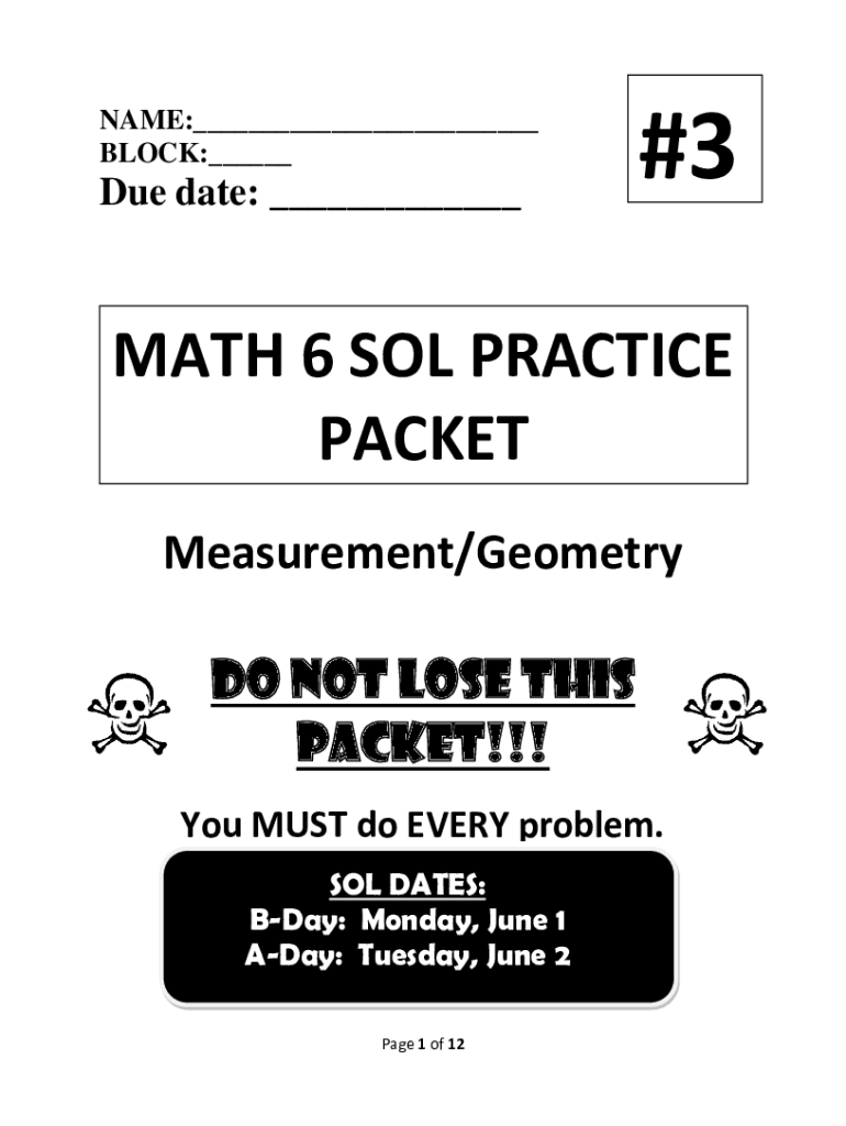 NAME:___ BLOCK:___Due date: ___#3MATH 6 SOL PRACTICE PACKET Measurement/Geometry do not lose this packet!!! You MUST do EVERY problem. SOL DATES: Day: Monday, June 1 Day: Tuesday, June 2 Page 1 of