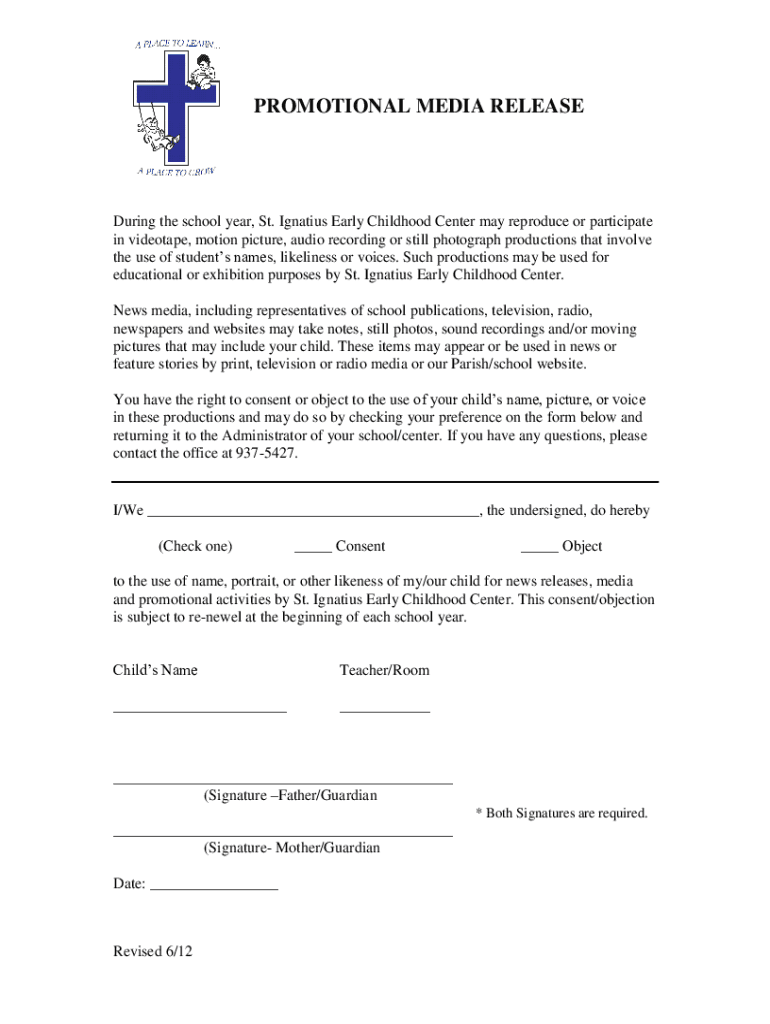 PROMOTIONAL MEDIA Remeasuring the school year, St. Ignatius Early Childhood Center may reproduce or participate in videotape, motion picture, audio recording or still photograph productions that involve