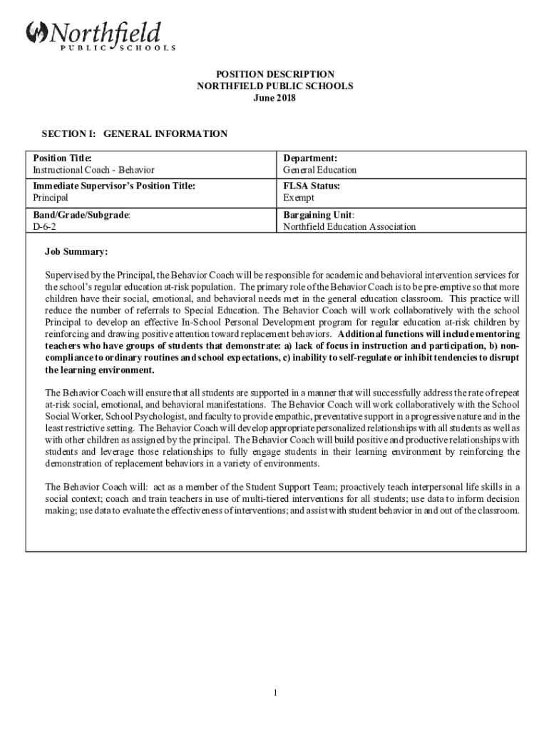 POSITION DESCRIPTION NORTHFIELD PUBLIC SCHOOLS June 2018 SECTION I: GENERAL INFORMATION Position Title: Instructional Coach BehaviorDepartment: General EducationImmediate Supervisors Position Title: