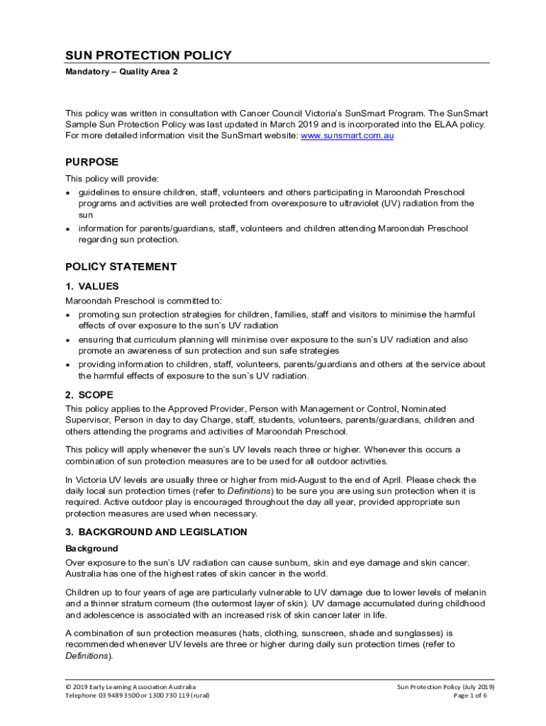 SUN PROTECTION POLICY Mandatory Quality Area 2This policy was written in consultation with Cancer Council Victoria's Sun Smart Program. The Sun Smart Sample Sun Protection Policy was last updated