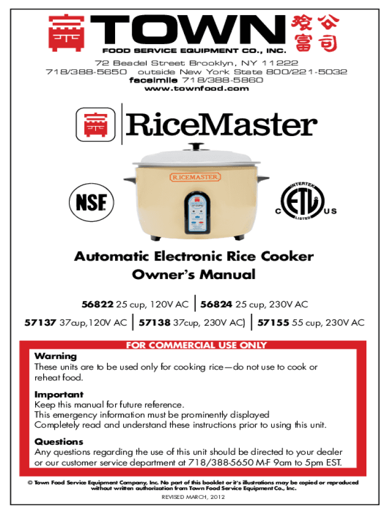 72 Beaded Street Brooklyn, NY 11222 718/3885650 outside New York State 800/2215032 facsimile 718/3885860 www.townfood.comAutomatic Electronic Rice Cooker Owners Manual| 56824 25 cup, 230V AC 57137
