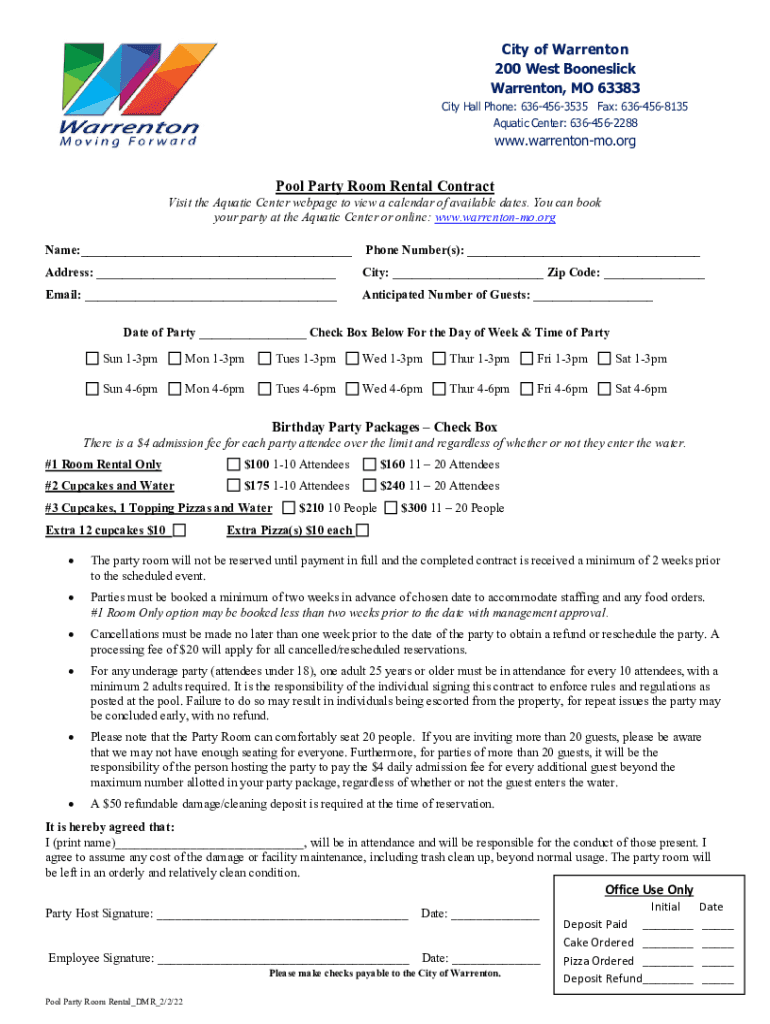 City of Warren ton 200 West Boone slick Warren ton, MO 63383City Hall Phone: 6364563535 Fax: 6364568135 Aquatic Center: 6364562288www.warrentonmo.pool Party Room Rental Contractility the Aquatic Center