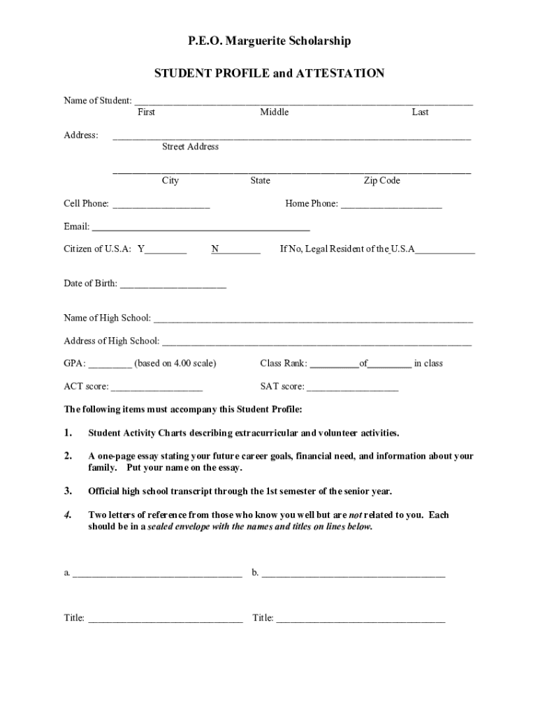 P.E.O. Marguerite Scholarship STUDENT PROFILE and ATTESTATION Name of Student: ___ First Middle Last Address:___ Street Address ___ City State Zip Code Cell Phone: ___Home Phone: ___Email: Citizen