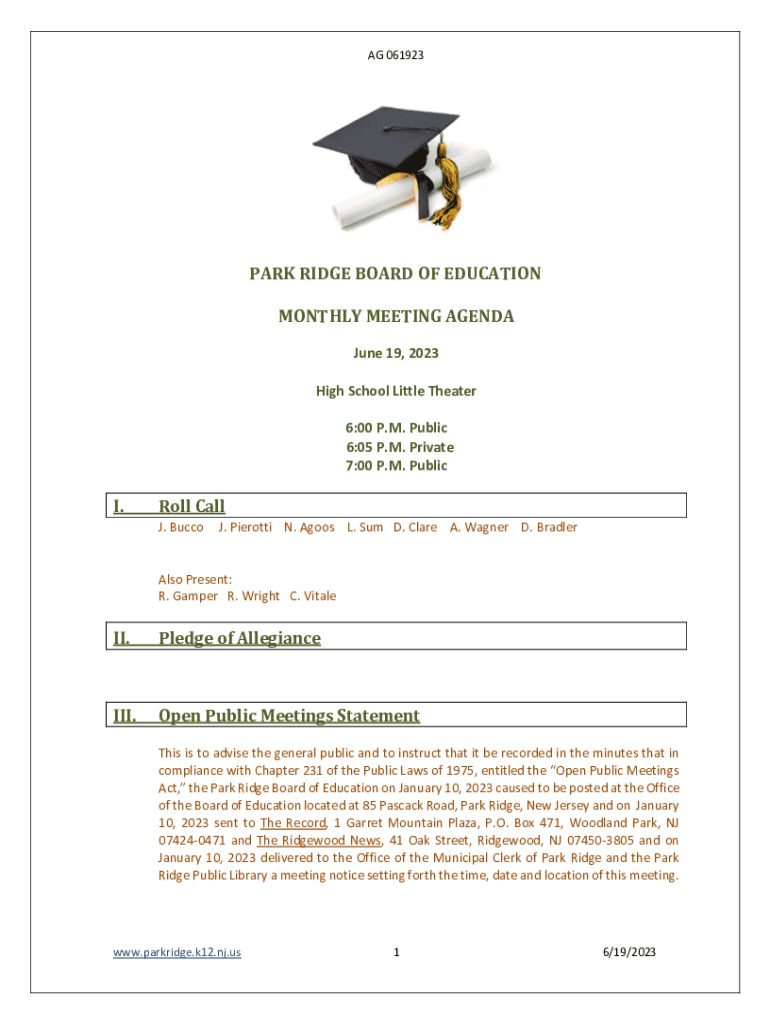 AG 061923PARK RIDGE BOARD OF EDUCATION MONTHLY MEETING AGENDA June 19, 2023, High School Little Theater 6:00 P.M. Public 6:05 P.M. Private 7:00 P.M. Public. Roll Call J. Succor. Pavarotti N. Adieus