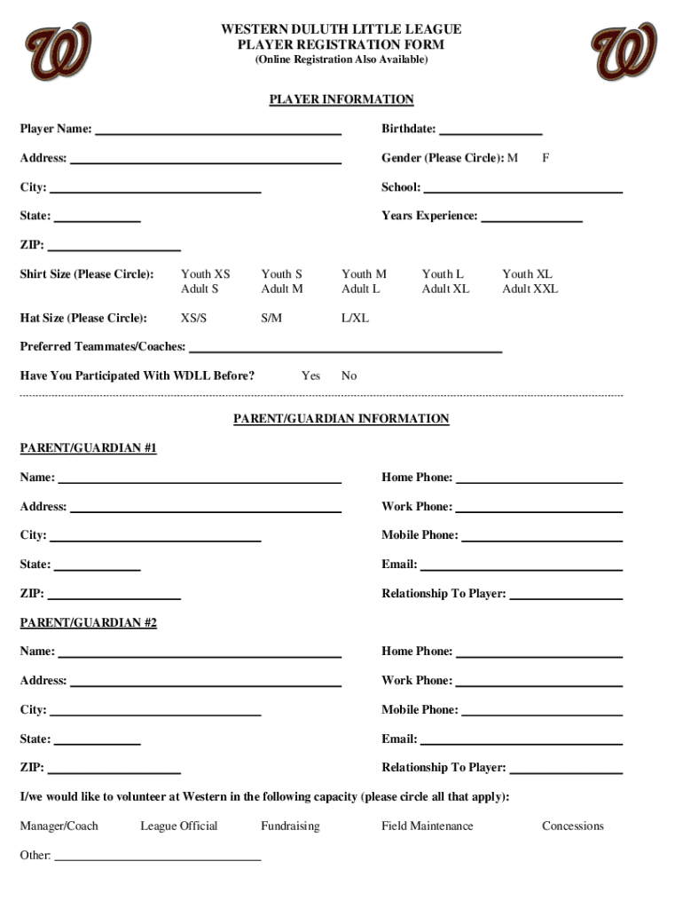 WESTERN DULUTH LITTLE LEAGUE PLAYER REGISTRATION FORM (Online Registration Also Available)PLAYER INFORMATION Player Name:Birthdate:Address:Gender (Please Circle): City:School:State:Years Experience:FLIP:
