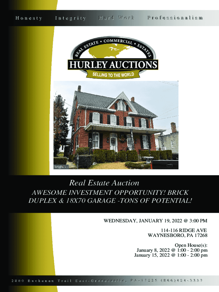 Real Estate Auction AWESOME INVESTMENT OPPORTUNITY! BRICK DUPLEX & 18×70 GARAGE TONS OF POTENTIAL! WEDNESDAY, JANUARY 19, 2022 @ 3:00 PM 114116 RIDGE AVE WAYNESBORO, PA 17268 Open House(s): January
