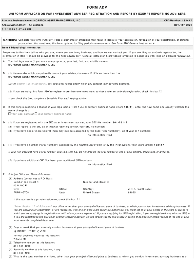 FORM ADV UNIFORM APPLICATION FOR INVESTMENT ADVISER REGISTRATION AND REPORT BY EXEMPT REPORTING ADVISERS Primary Business Name: MORTON ASSET MANAGEMENT, LLC CRD Number: 133417Annual Amendment All