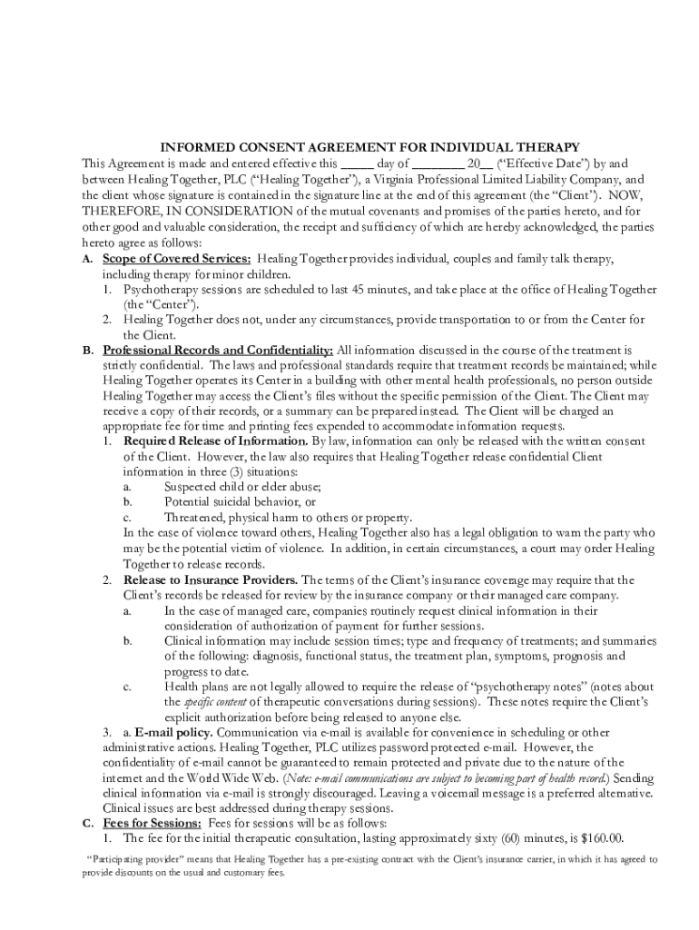 INFORMED CONSENT AGREEMENT FOR INDIVIDUAL THERAPY This Agreement is made and entered effective this ___ day of ___ 20__ (Effective Date) by and between Healing Together, PLC (Healing Together), a
