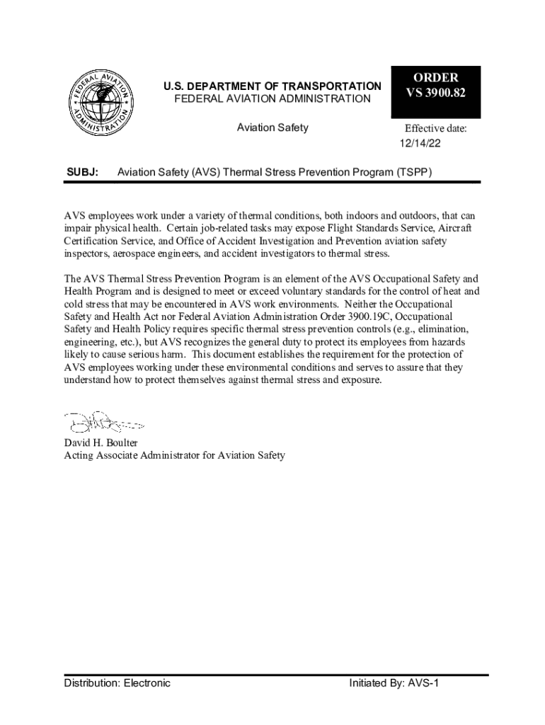 U.S. DEPARTMENT OF TRANSPORTATION FEDERAL AVIATION ADMINISTRATION Aviation SafetySUBJ:ORDER VS 3900.82 Effective date: 12/14/22Aviation Safety (AVS) Thermal Stress Prevention Program (TSP)AVS employees