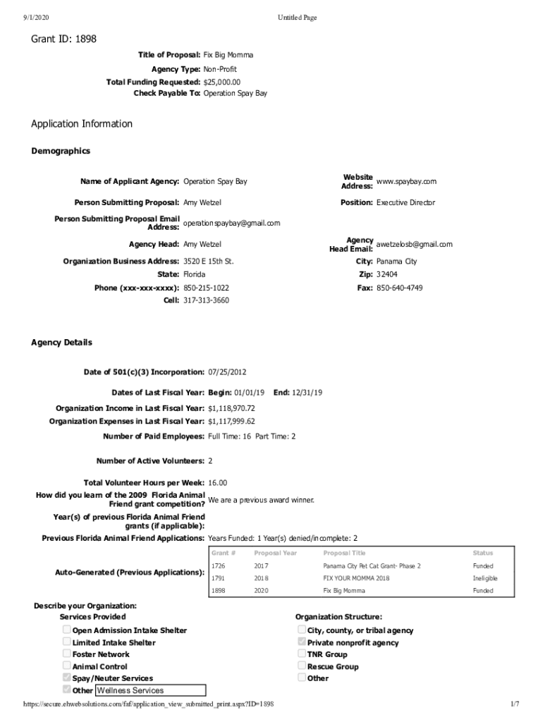 9/1/2020Untitled Page Grant ID: 1898 Title of Proposal: Fix Big Mother Agency Type: Nonprofit Total Funding Requested: $25,000.00 Check Payable To: Operation Spay Application Information Demographics