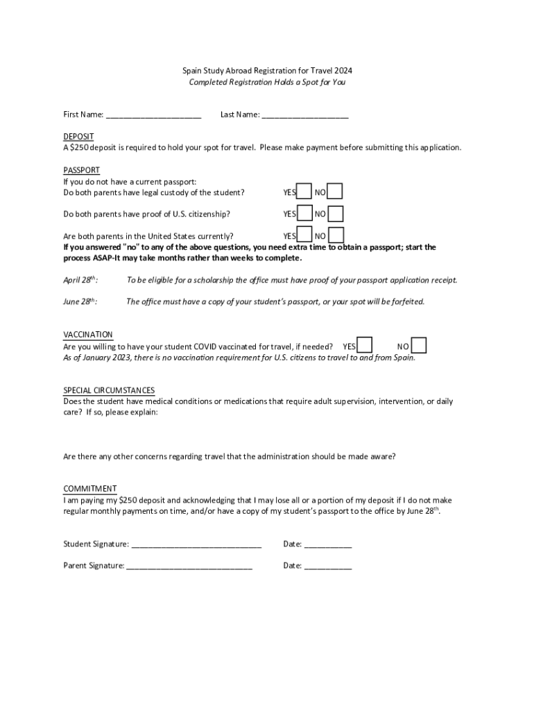 Spain Study Abroad Registration for Travel 2024 Completed Registration Holds a Spot for You First Name: ___Last Name: ___DEPOSIT A $250 deposit is required to hold your spot for travel. Please make