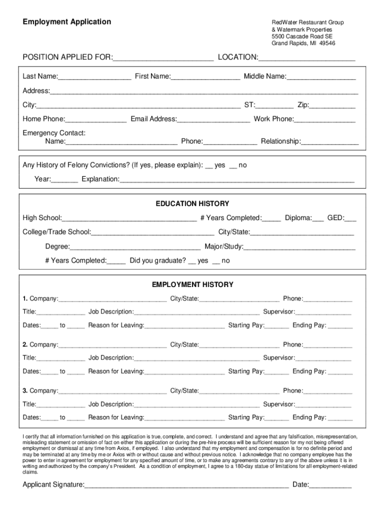 Employment ApplicationRedWater Restaurant Group & Watermark Properties 5500 Cascade Road SE Grand Rapids, MI 49546POSITION APPLIED FOR:___ LOCATION:___ Last Name:___ First Name:___ Middle Name:___