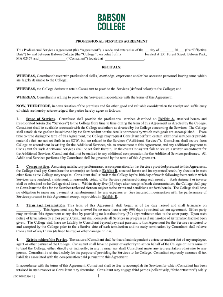 PROFESSIONAL SERVICES AGREEMENT This Professional Services Agreement (this Agreement) is made and entered as of the __ day of ___, 20___ (the Effective Date) by and between Baboon College (the College),
