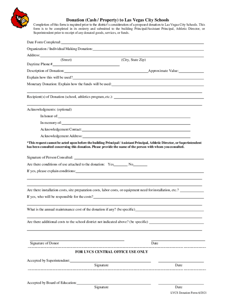 Donation (Cash / Property) to Las Vegas City Schools Completion of this form is required prior to the districts' consideration of a proposed donation to Las Vegas City Schools. This form is to be