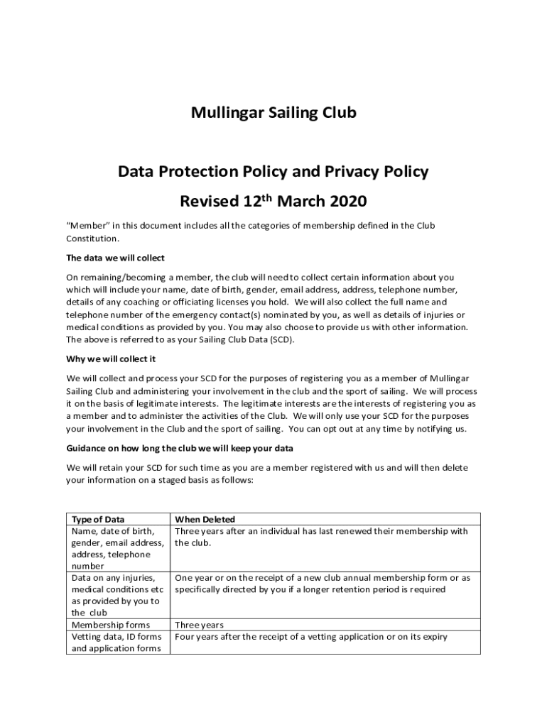 Mulligan Sailing Club Data Protection Policy and Privacy Policy Revised 12th March 2020 Member in this document includes all the categories of membership defined in the Club Constitution. The data