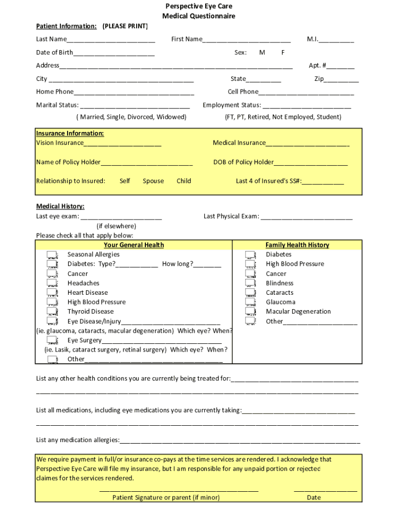 Perspective Eye Care Medical Questionnaire Patient Information: (PLEASE PRINT) Last Name___First Name___Date of Birth___Sex:Address___ City ___ Home Phone___ Marital Status: ___ (Married, Single,