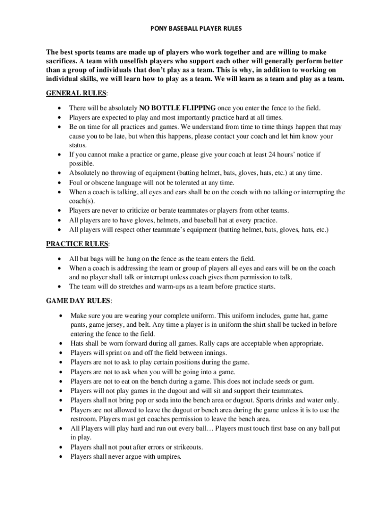 PONYBASEBALLPLAYERRULES The best sports teams are made up of players who work together and are willing to make sacrifices. A team with unselfish players who support each other will generally perform
