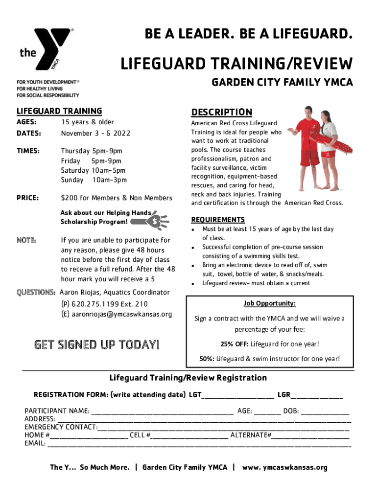 BE A LEADER. BE A LIFEGUARD.LIFEGUARD TRAINING/REVIEW GARDEN CITY FAMILY YMCA DESCRIPTIONLIFEGUARD TRAINING AGES: DATES:15 years & older November 3 6 2022TIMES:Thursday 5pm9pm Friday 5pm9pm Saturday