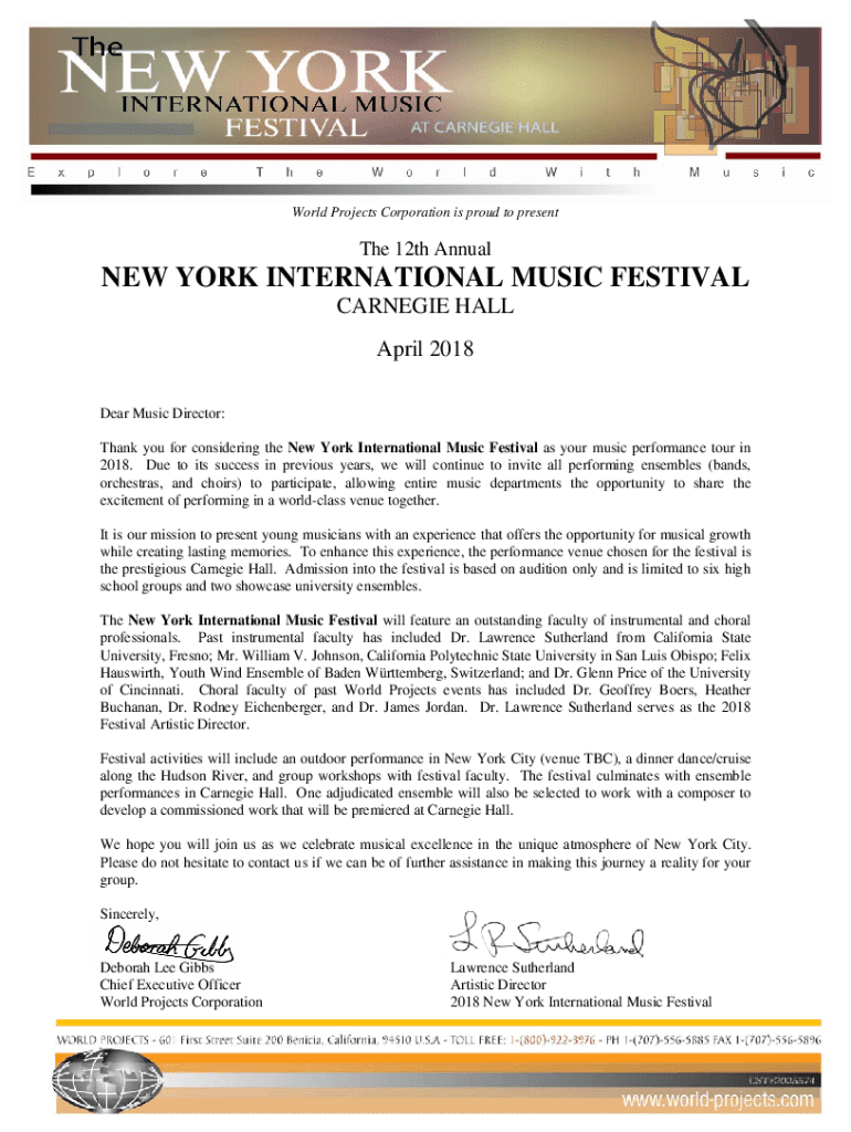 World Projects Corporation is proud to present 12th Annual YORK INTERNATIONAL MUSIC FESTIVAL CARNEGIE HALL April 2018 Dear Music Director: Thank you for considering the New York International Music