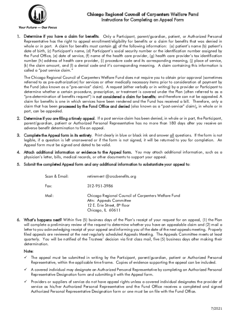 Chicago Regional Council of Carpenters Welfare Fund Instructions for Completing an Appeal Form1. Determine if you have a claim for benefits. Only a Participant, parent/guardian, patient, or Authorized