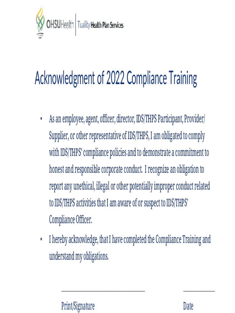 Acknowledgment of 2022 Compliance Training As an employee, agent, officer, director, IDS/THIS Participant, Provider/ Supplier, or other representative of IDS/THIS, I am obligated to comply with IDS/THIS
