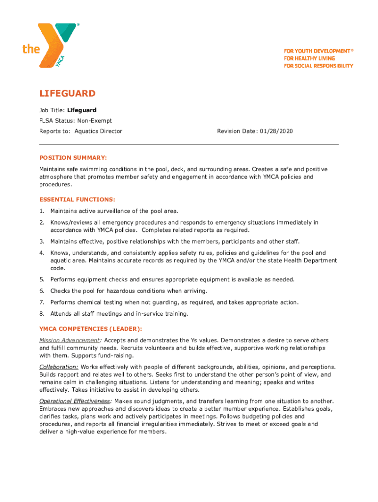 LIFEGUARD Job Title: Lifeguard FLEA Status: Nonexempt Reports to: Aquatics DirectorRevision Date: 01/28/2020POSITION SUMMARY: Maintains safe swimming conditions in the pool, deck, and surrounding