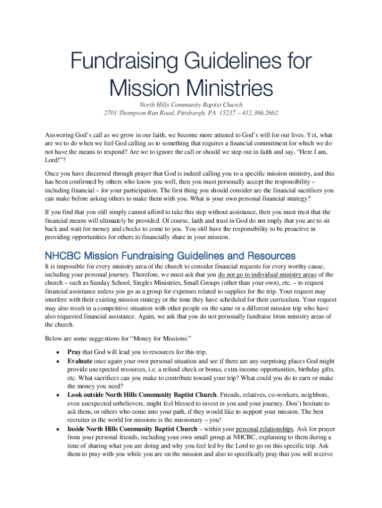 Fundraising Guidelines for Mission Ministries North Hills Community Baptist Church 2701 Thompson Run Road, Pittsburgh, PA 15237 412.366.2662 Answering Gods call as we grow in our faith, we become
