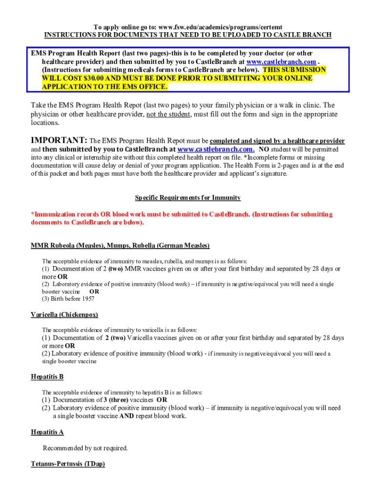 To apply online go to: www.fsw.edu/academics/programs/certemt INSTRUCTIONS FOR DOCUMENTS THAT NEED TO BE UPLOADED TO CASTLE BRANCHES Program Health Report (last two pages)this is to be completed by