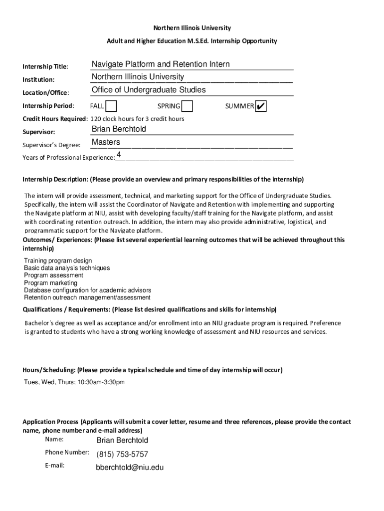 Northern Illinois University Adult and Higher Education M.S. Ed. Internship Opportunity Internship Title:Navigate Platform and Retention InternInstitution:Northern Illinois University ___Location/Office:Office